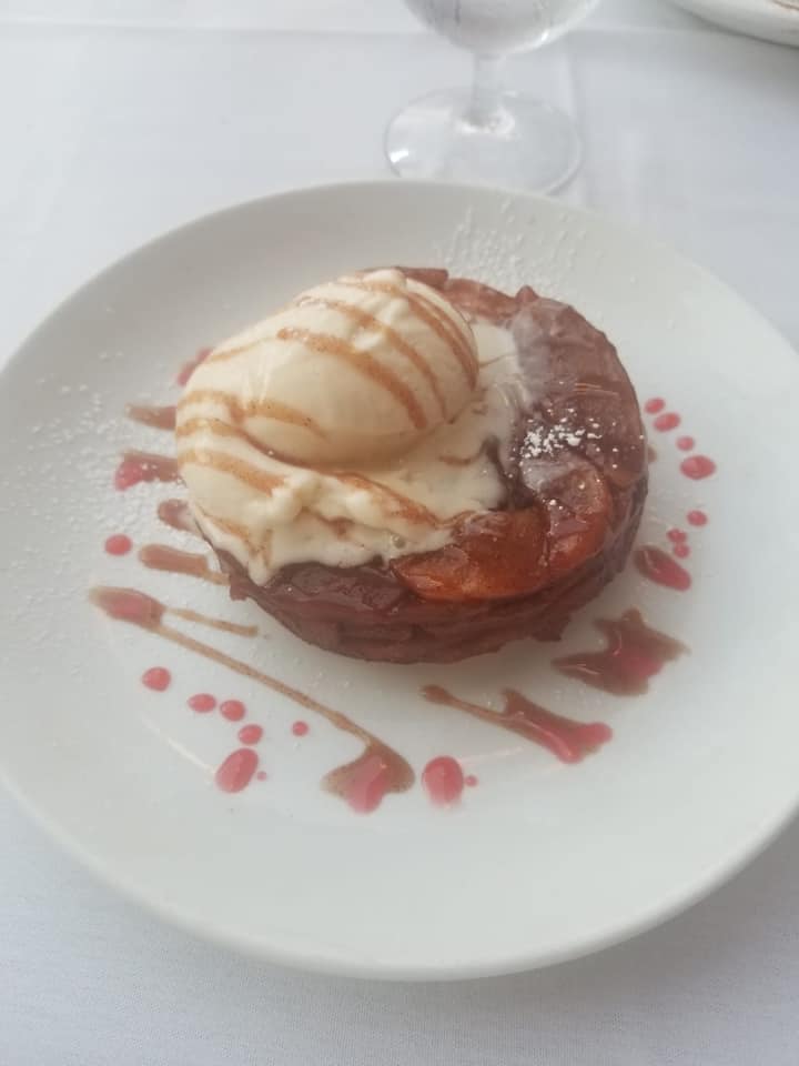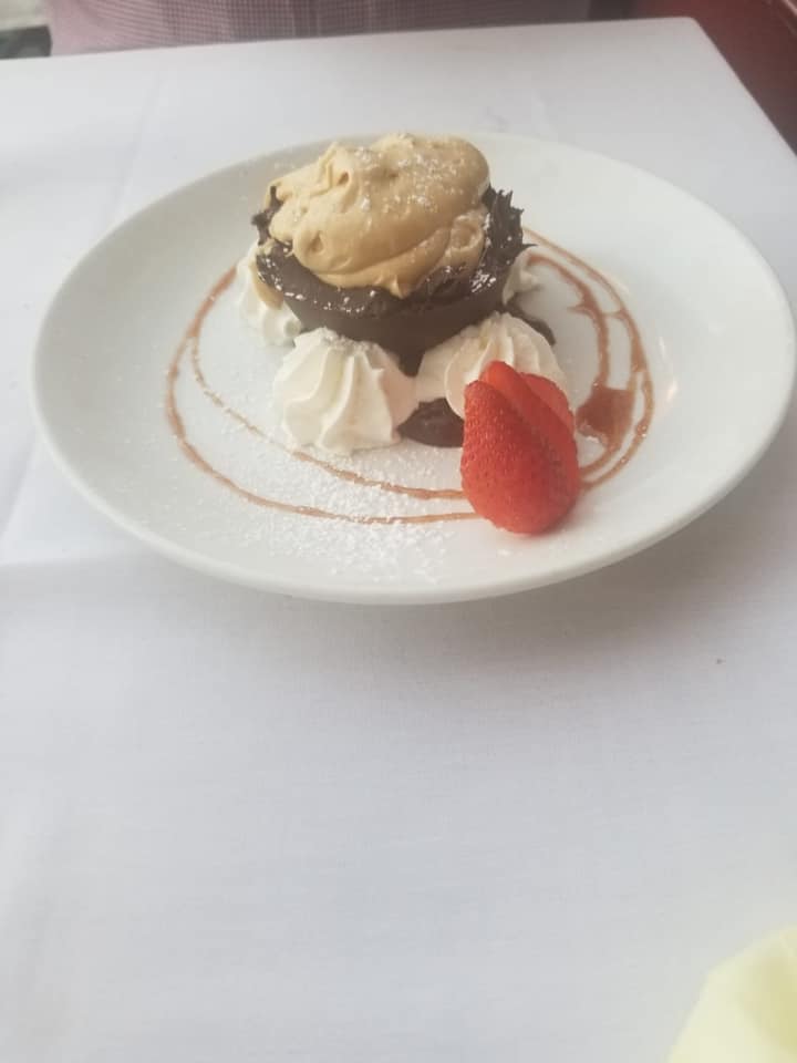 We opted to get dessert… and that was either our best idea or worst idea depending on if you consulted our taste buds or our ability to move. I got the Chocolate Peanut Butter Saucer ($14). This was one of the best desserts I’ve ever had. It was a large chocolate ganache cup filled with peanut butter mousse, sitting in hot fudge and whipped cream. My wife got the Apple Galette ($14). It came with caramel ice cream on top and was also delicious and massive. We probably would’ve shared one if we’d known they were that big. But we aren’t quitters, so we finished them against our better judgement.