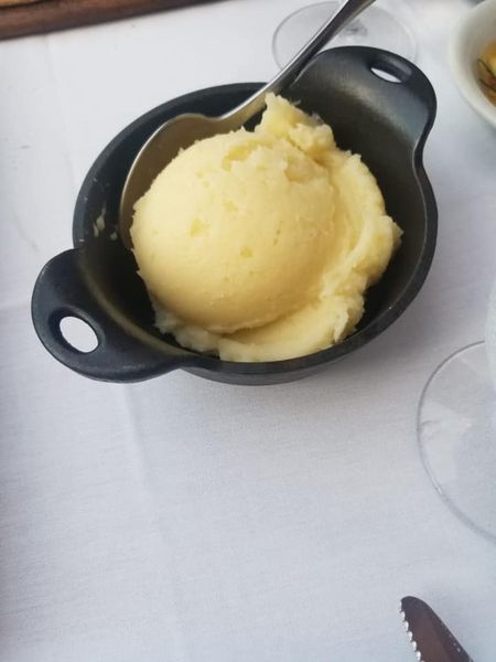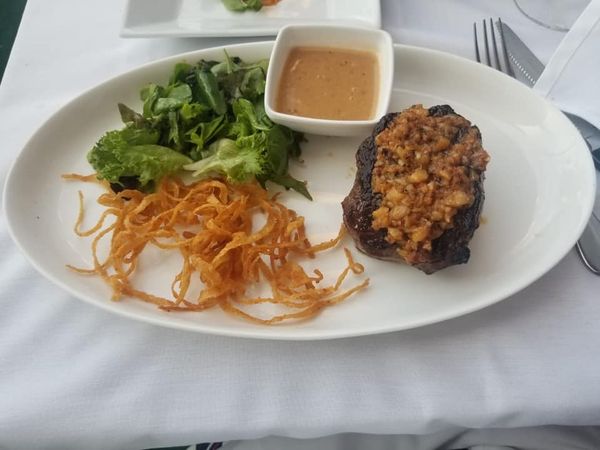 My wife ordered a Garlic-Crusted Filet ($56). It was cooked perfectly and was extremely tasty. It came with some shoestring onions and a small pile of greens. The onions were solid, but the greens weren’t dressed so that was a bit confusing. My wife also got a side of Whipped Yukon Potatoes ($10). These tasted like absolutely nothing. And I mean that. I’m not even sure there was salt in them. She asked for and received gravy, which improved them greatly.